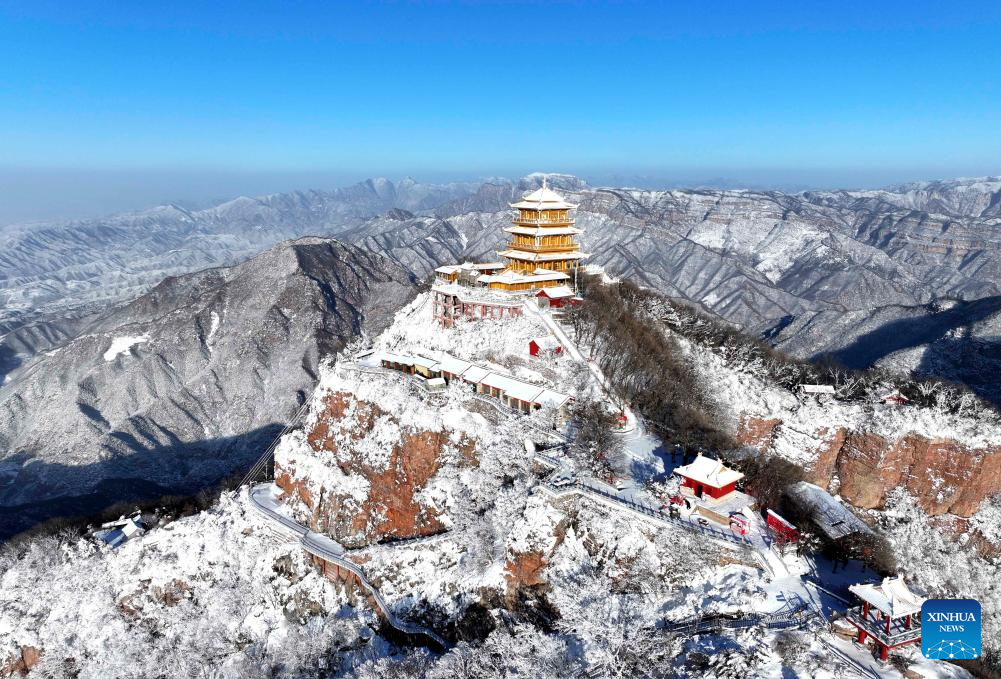 An aerial drone photo shows the snow scenery of the Wangwu Mountain scenic spot in Jiyuan City, central China's Henan Province, Jan. 26, 2025. (Photo by Duan Erping/Xinhua)