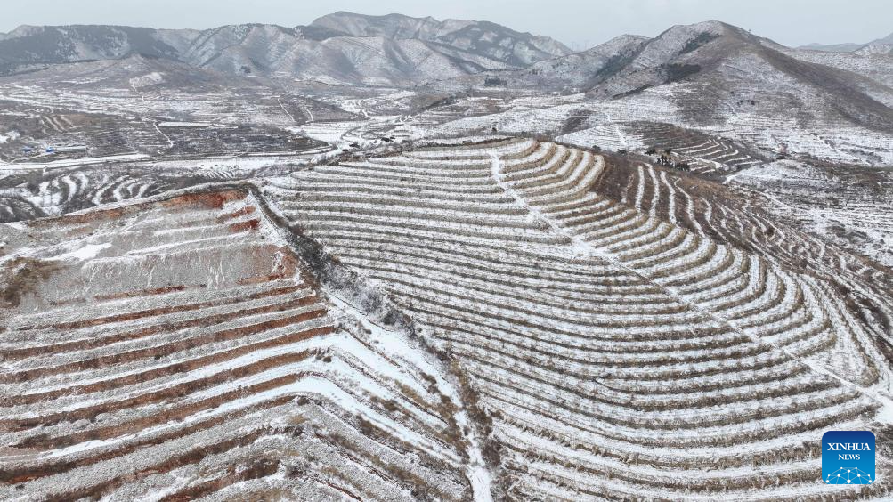 An aerial drone photo shows the snow scenery of terraced fields in Shuangxian Town of Pingliang City, northwest China's Gansu Province, Jan. 26, 2025. (Photo by Wang Yi/Xinhua)