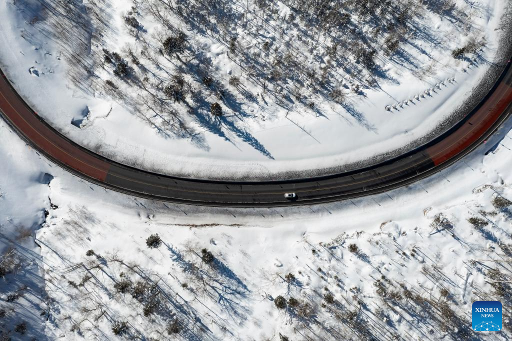 An aerial drone photo taken on Jan. 25, 2025 shows a vehicle running on the Yaxue Road in northeast China's Heilongjiang Province. As part of national highway G333, Yaxue Road connects Harbin, Yabuli, and "Snow Town," all of them iconic winter tourist attractions in northeast China, offering visitors the natural and cultural charm of the region. (Xinhua/Xie Jianfei)