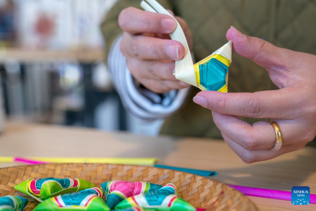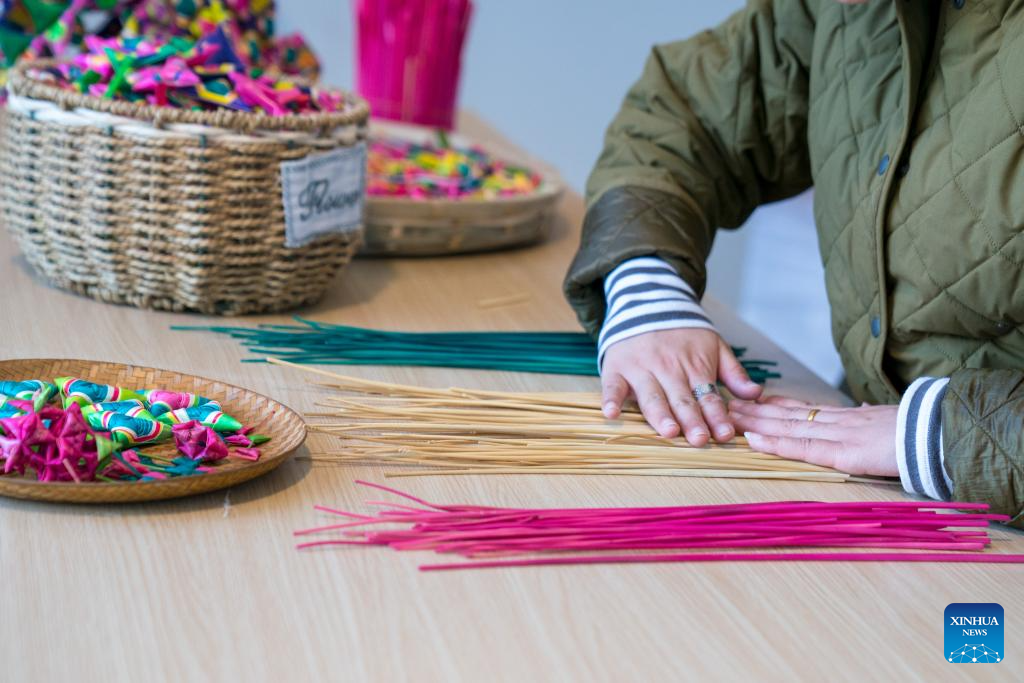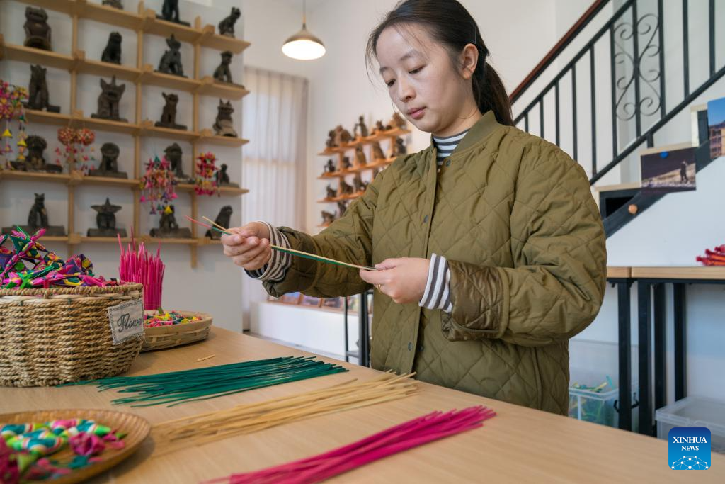 Yang Jie makes a rhombic straw plaited work at her studio in Kunming, southwest China's Yunnan Province, Jan. 25, 2025. The art of rhombic straw plaiting is a traditional handicraft with a long history. It was included in the third batch of Yunnan's provincial intangible cultural heritage list in 2013. Artisans sort and dye straws, and weave them into triangular shapes. Finally, they are strung together by thread to create various designs symbolizing good fortune.