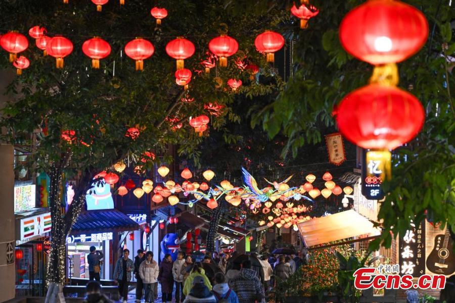 Tourists enjoy lanterns at the 18 Steps, a well-known popular tourist spot that features a blend of ancient architecture and modern retail spaces, in Chongqing, Jan. 25, 2025. (China News Service/He Penglei)