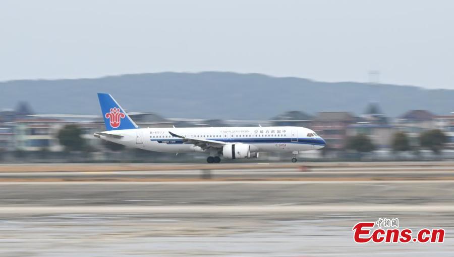 A C919 passenger jet operated by the China Southern Airlines lands at Xiaoshan International Airport in Hangzhou, east China's Zhejiang Province, Jan. 26, 2025. (China News Service/Wang Gang)