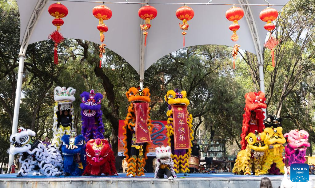 A lion dance performance is staged at the 4th edition of the Chinese New Year cultural festival at the National Arts Center in Mexico City, capital of Mexico, Jan. 25, 2025. The cultural festival kicked off here Saturday to celebrate the upcoming Spring Festival, or the Chinese Lunar New Year. (Xinhua/Li Mengxin)