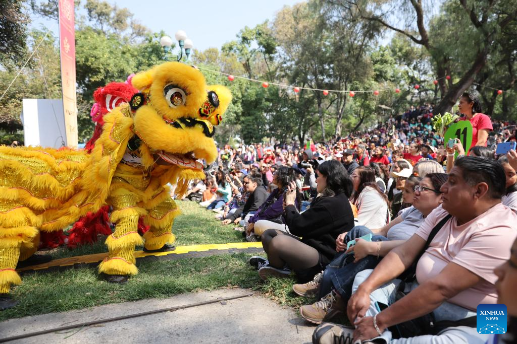 People watch a lion dance performance at the 4th edition of the Chinese New Year cultural festival at the National Arts Center in Mexico City, capital of Mexico, Jan. 25, 2025. The cultural festival kicked off here Saturday to celebrate the upcoming Spring Festival, or the Chinese Lunar New Year. (Xinhua/Li Mengxin)