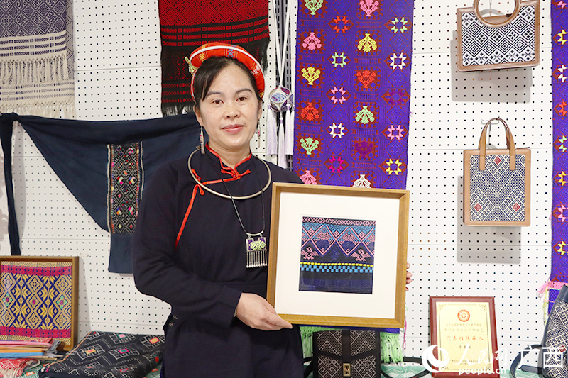 Li Suying showcases Zhuang brocade products featuring elements of various ethnic groups. (People's Daily Online/He Ning)