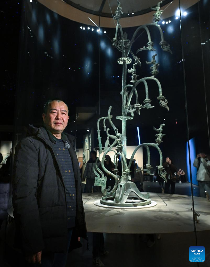 Guo Hanzhong poses for photo with bronze sacred tree at Sanxingdui Museum in Guanghan City, southwest China's Sichuan Province, Dec. 18, 2024.