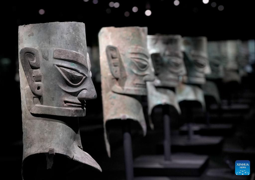 Bronze heads are on display in the new building of Sanxingdui Museum in Guanghan City, southwest China's Sichuan Province, Dec. 18, 2024.