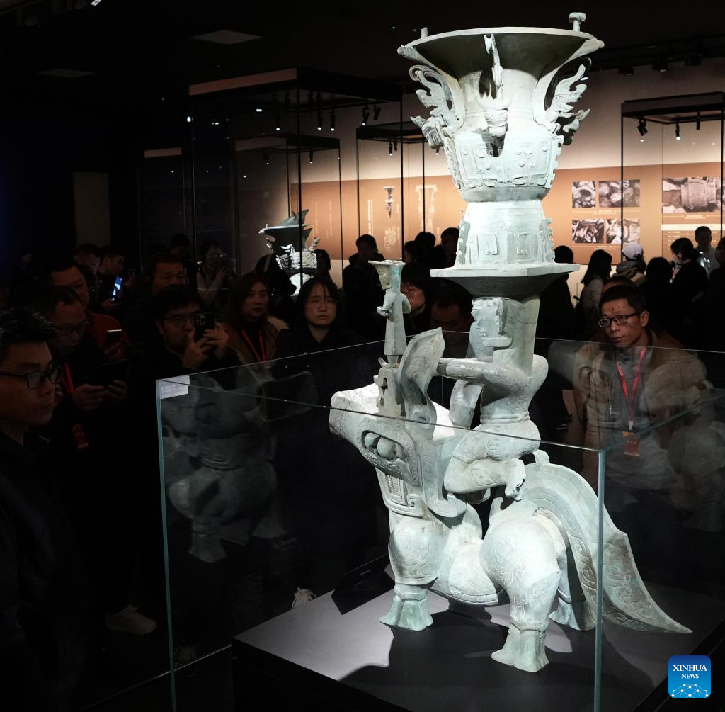 Visitors look at an exhibit in the new building of Sanxingdui Museum in Guanghan City, southwest China's Sichuan Province, Dec. 18, 2024.