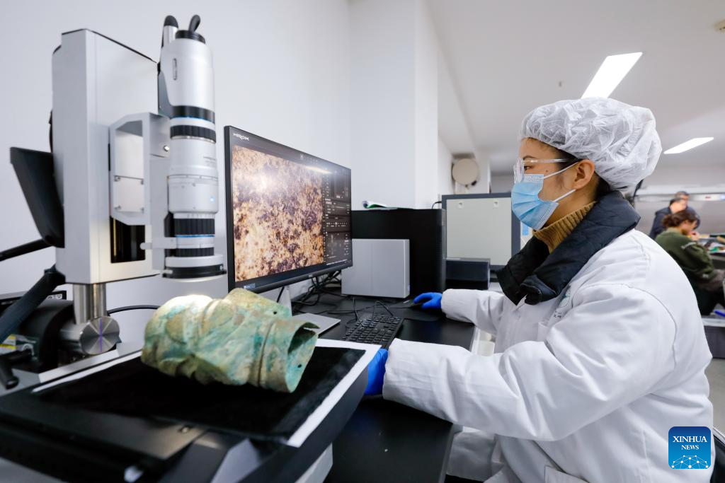 A restorer looks at surface details of a bronze mask through ultra-depth-of-field microscope at Sanxingdui Museum in Guanghan City, southwest China's Sichuan Province, Dec. 18, 2024.