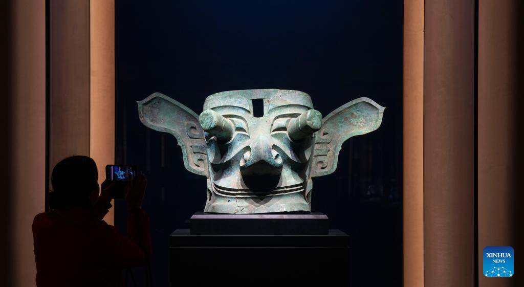 A visitor looks at a bronze mask on display in the new building of Sanxingdui Museum in Guanghan City, southwest China's Sichuan Province, Dec. 18, 2024.