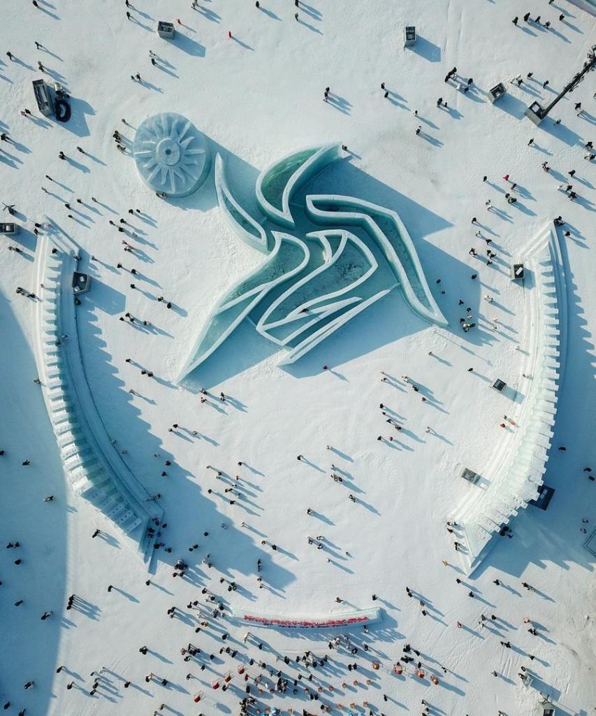 At the Harbin Ice-Snow World, a theme park dedicated to the Asian Winter Games, visitors are treated with a spectacular drone show celebrating the Chinese New Year. The park also features a variety of ice sculptures with festive themes, including a carp symbolizing prosperity and the Chinese character Fu (meaning good fortune) carved in ice.