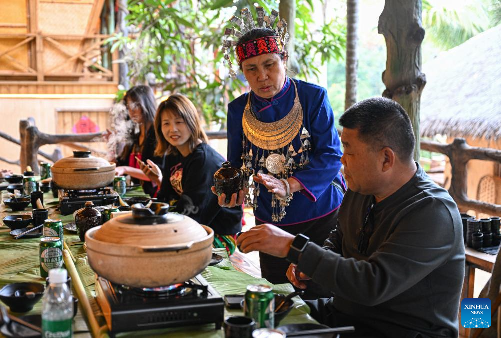 A villager serves traditional rice wine of Li ethnic group at Binglanggu tourism area in Baoting Li and Miao Autonomous County, south China's Hainan Province, Jan. 28, 2025. An event featuring Li ethnic group culture was held at Binglanggu tourism area to celebrate the Chinese New Year, where tourists could dress in traditional Li attire and taste food with Li characteristics. (Xinhua/Pu Xiaoxu)