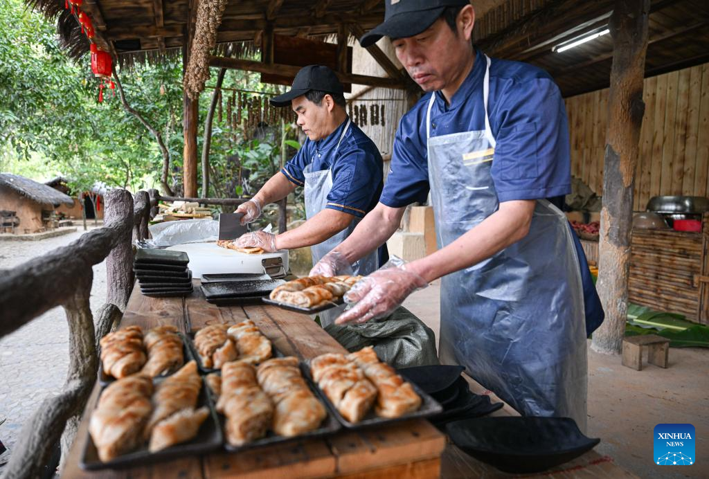Villagers serve traditional snacks at Binglanggu tourism area in Baoting Li and Miao Autonomous County, south China's Hainan Province, Jan. 28, 2025. An event featuring Li ethnic group culture was held at Binglanggu tourism area to celebrate the Chinese New Year, where tourists could dress in traditional Li attire and taste food with Li characteristics. (Xinhua/Pu Xiaoxu)