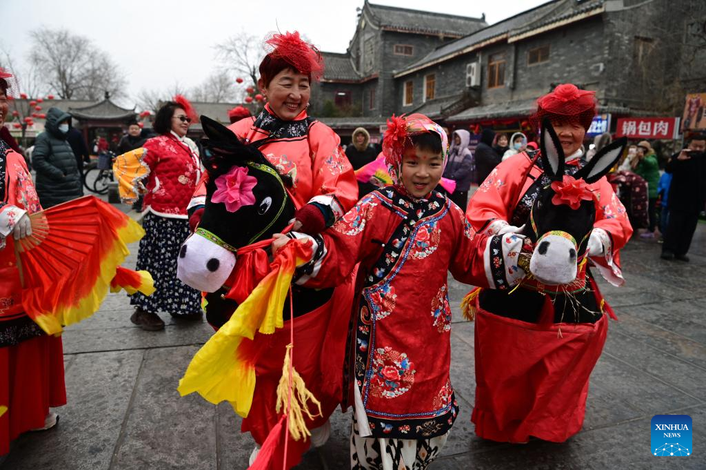 Folk artists stage a Yangge performance at an ancient town scenic spot in Liaocheng City, east China's Shandong Province, Jan. 31, 2025. People enjoy various activities to celebrate the Chinese New Year which falls on Jan. 29 this year. (Photo by Zhang Zhenxiang/Xinhua)