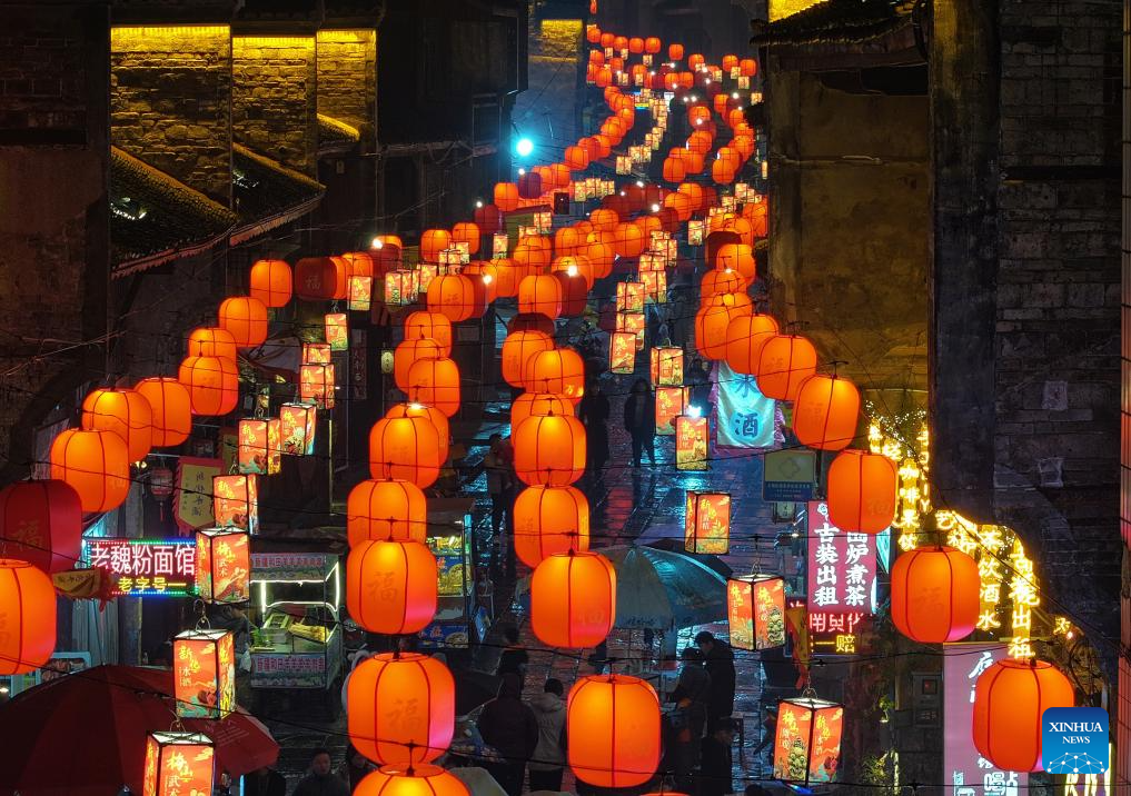 An aerial drone photo shows people visiting Xiangdong Street of Xinhua County, Loudi City, central China's Hunan Province, Jan. 30, 2025. People enjoy various activities to celebrate the Chinese New Year which falls on Jan. 29 this year. (Xinhua/Chen Zhenhai)