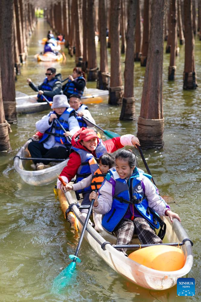 People row among trees at Haihong Wetland Park in Kunming, southwest China's Yunnan Province on Jan. 31, 2025. People enjoy various activities to celebrate the Chinese New Year which falls on Jan. 29 this year. (Xinhua/Chen Xinbo)