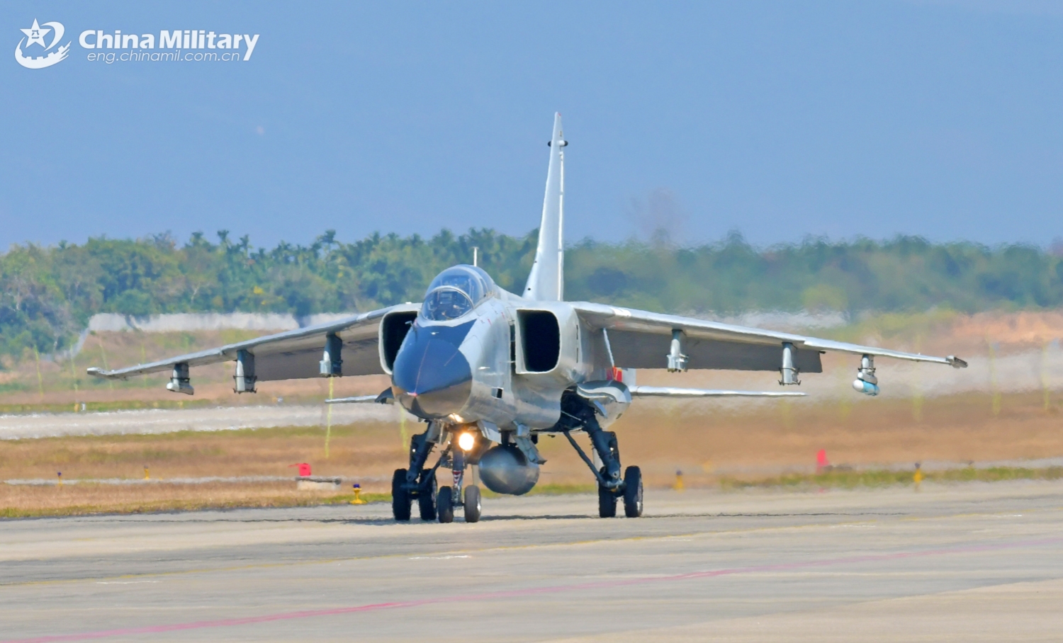A JH-7 fighter bomber attached to a brigade with the air force under the Chinese PLA Southern Theater Command taxies on the runway during a multi-subject flight training exercise on January 11, 2025. (eng.chinamil.com.cn/Photo by Zhuo Lingpeng)