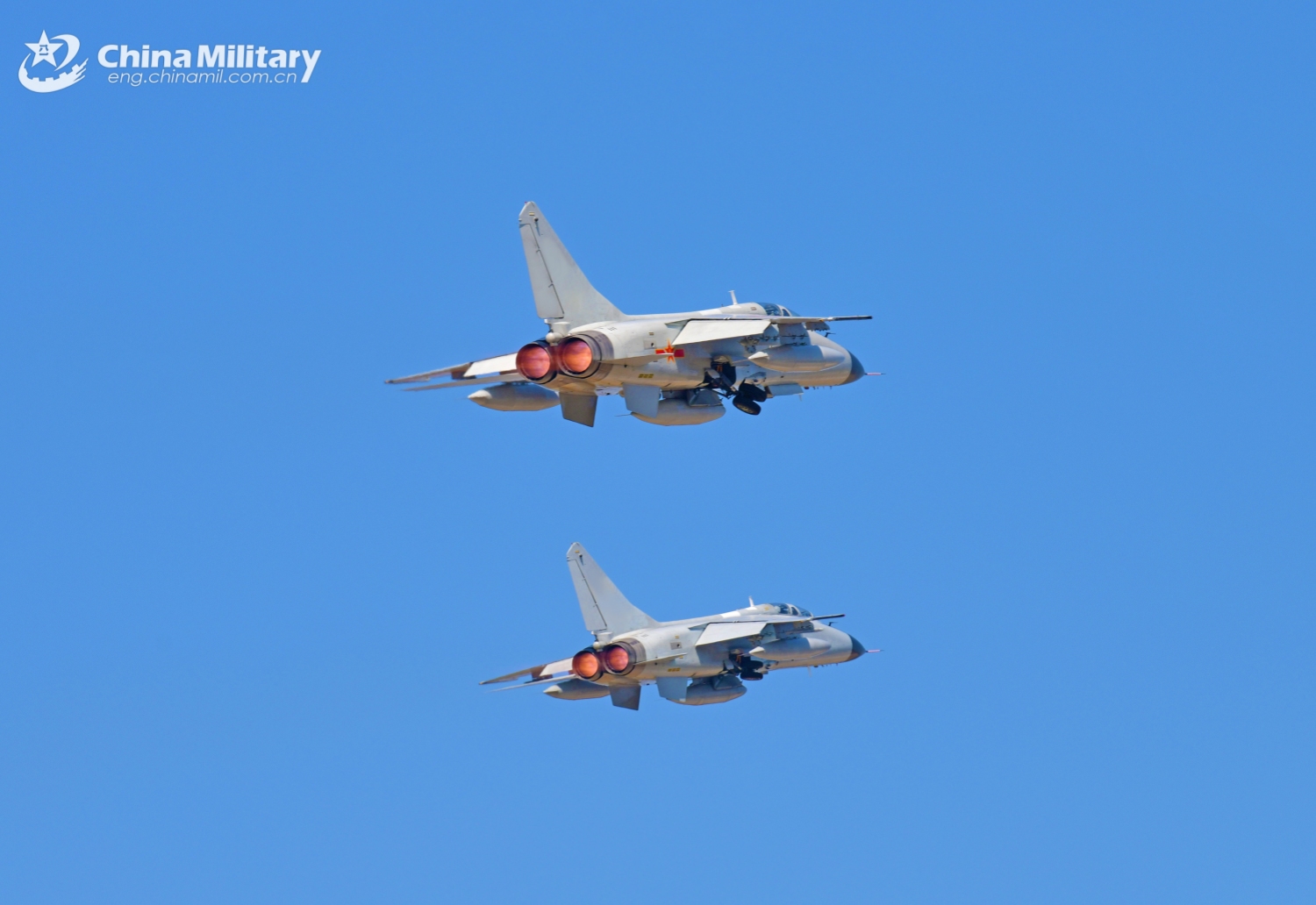 Two JH-7 fighter bombers attached to a brigade with the air force under the Chinese PLA Southern Theater Command fly towards the designated airspace during a multi-subject flight training exercise on January 11, 2025. (eng.chinamil.com.cn/Photo by Zhuo Lingpeng)