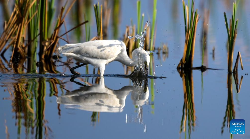 A egret forages at Haiwei wetland in Changjiang Li Autonomous County, south China's Hainan Province, Jan. 24, 2025. As one of the few coastal freshwater swamp wetlands in Hainan Island, the ecosystem and biodiversity of Haiwei wetland are being effectively protected, and it has become an important habitat for migratory birds on the west coast of Hainan Island. (Xinhua/Yang Guanyu)