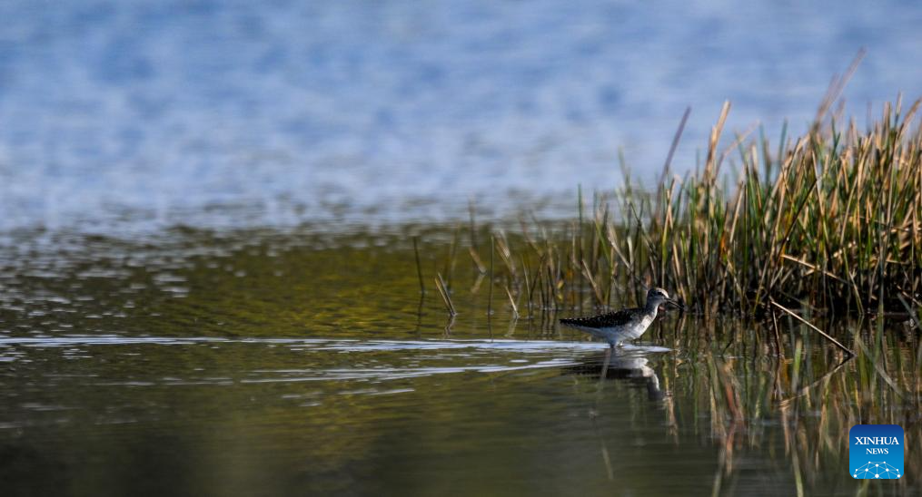 A wood sandpiper is pictured at Haiwei wetland in Changjiang Li Autonomous County, south China's Hainan Province, Jan. 23, 2025. As one of the few coastal freshwater swamp wetlands in Hainan Island, the ecosystem and biodiversity of Haiwei wetland are being effectively protected, and it has become an important habitat for migratory birds on the west coast of Hainan Island. (Xinhua/Yang Guanyu)