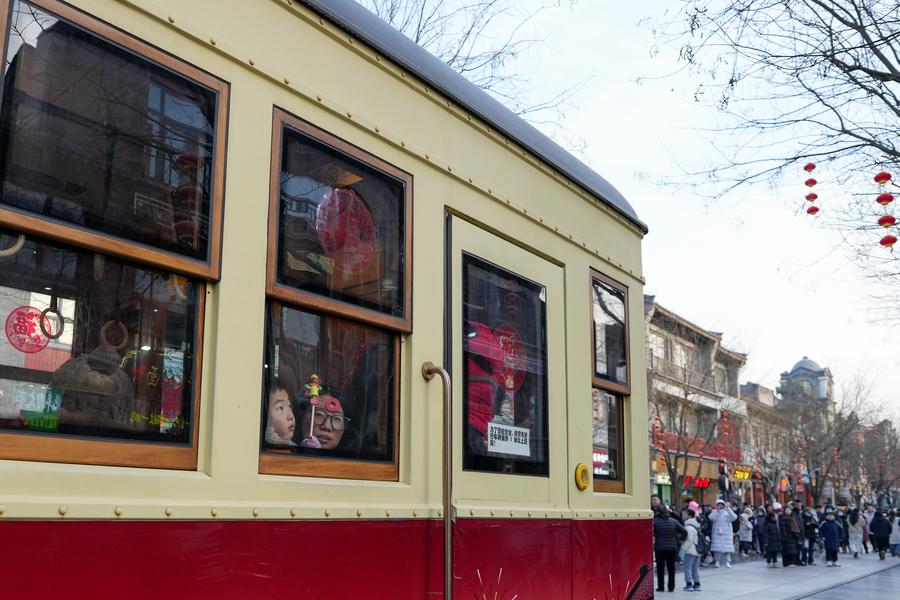 Tourists take a sightseeing tram at the Qianmen Street along the Central Axis in Beijing, capital of China, Jan. 29, 2025. (Xinhua/Ju Huanzong)