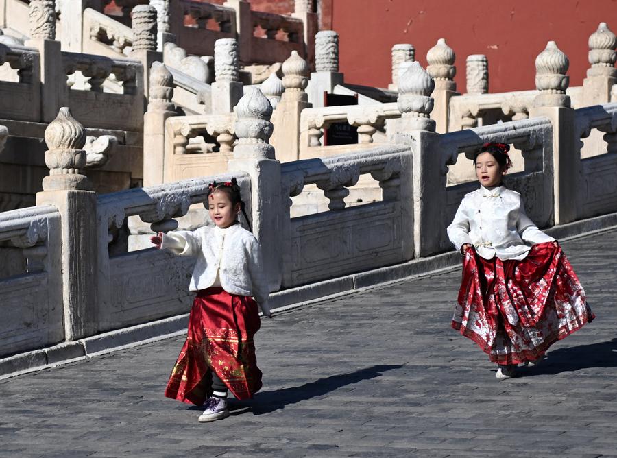 Girls play at the Palace Museum along the Central Axis in Beijing, capital of China, Feb. 2, 2025. (Xinhua/Zhang Chenlin)