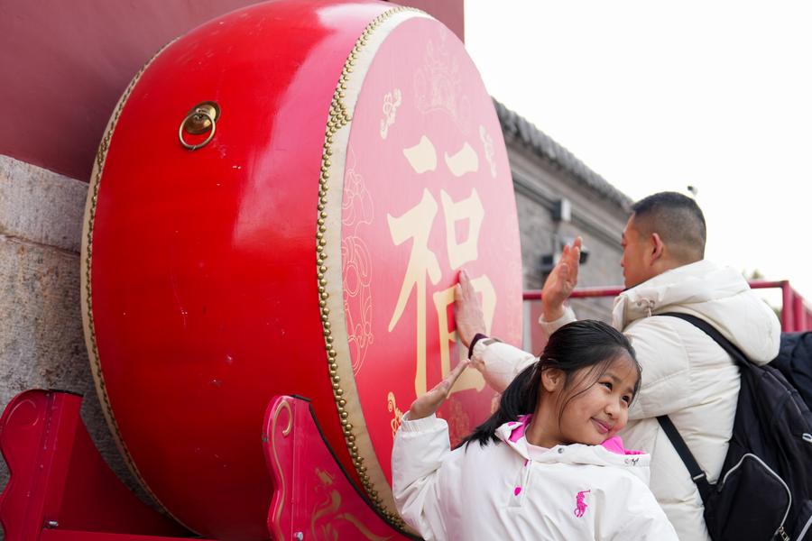 A girl poses for photos with a drum for good fortune under the Drum Tower along the Central Axis in Beijing, capital of China, Jan. 31, 2025. (Xinhua/Ju Huanzong)