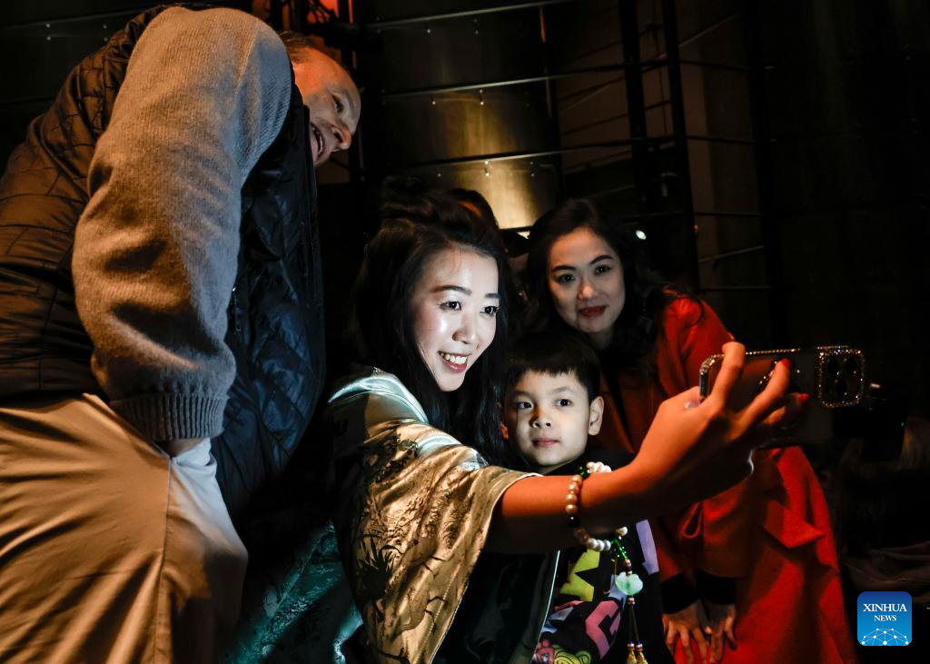 Attendees pose for a selfie at the Chinese New Year Showcase in Chicago, the United States, Feb. 1, 2025. (Photo by Joe Lerner/Xinhua)