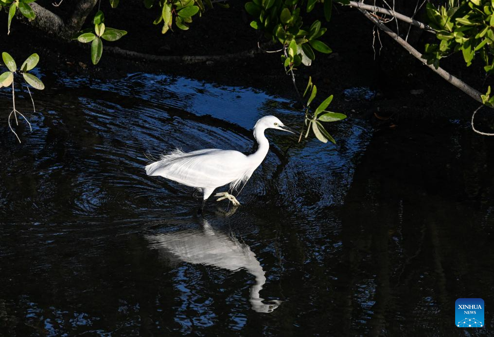 An egret is pictured among mangroves at the Hainan Lingshui Mangrove National Wetland Park in south China's Hainan Province, Jan. 31, 2025. Home to thousands of waterfowl, the park covering 958.22 hectares has resulted from uncompromising efforts of the local authorities since 2016 to restore and protect the mangrove ecological systems. (Xinhua/Pu Xiaoxu)