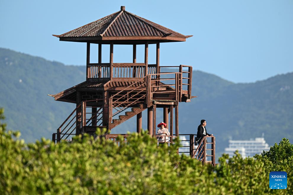 Visitors are pictured at the Hainan Lingshui Mangrove National Wetland Park in south China's Hainan Province, Jan. 31, 2025. Home to thousands of waterfowl, the park covering 958.22 hectares has resulted from uncompromising efforts of the local authorities since 2016 to restore and protect the mangrove ecological systems. (Xinhua/Pu Xiaoxu)