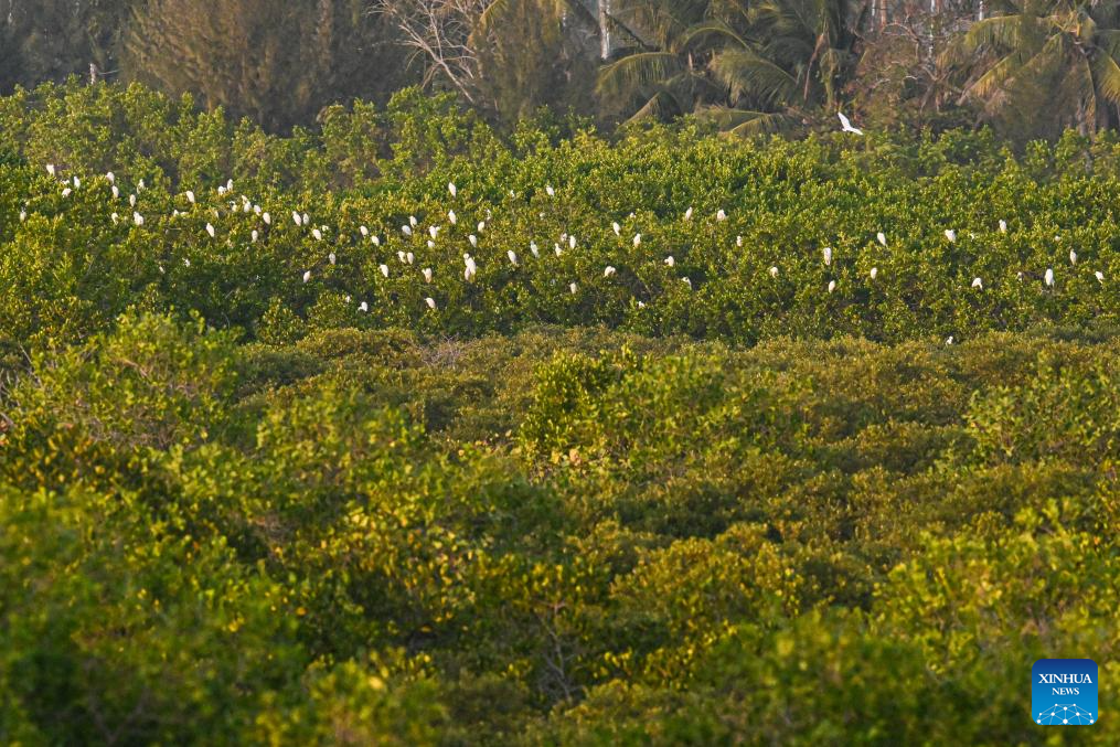 Egrets perch at the Hainan Lingshui Mangrove National Wetland Park in south China's Hainan Province, Jan. 31, 2025. Home to thousands of waterfowl, the park covering 958.22 hectares has resulted from uncompromising efforts of the local authorities since 2016 to restore and protect the mangrove ecological systems. (Xinhua/Pu Xiaoxu)
