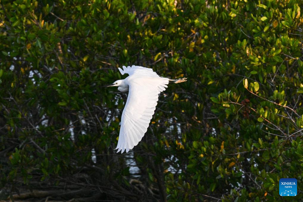 An egret flies at the Hainan Lingshui Mangrove National Wetland Park in south China's Hainan Province, Jan. 31, 2025. Home to thousands of waterfowl, the park covering 958.22 hectares has resulted from uncompromising efforts of the local authorities since 2016 to restore and protect the mangrove ecological systems. (Xinhua/Pu Xiaoxu)