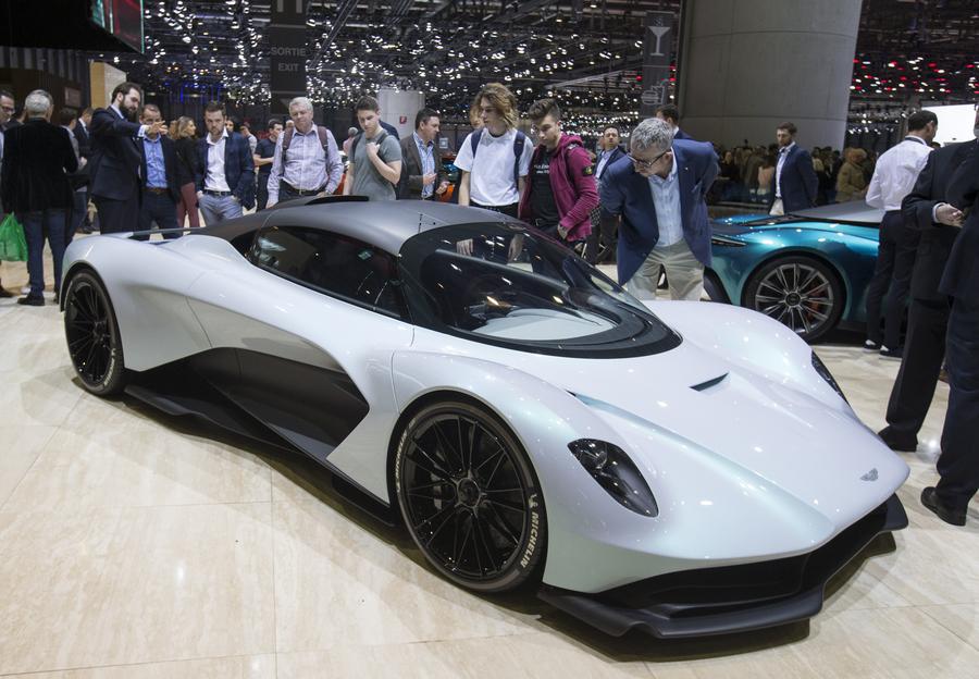 People watch the Aston Martin AM-RB 003 hypercar at the 89th Geneva International Motor Show in Geneva, Switzerland, March 7, 2019. (Xinhua/Xu Jinquan)