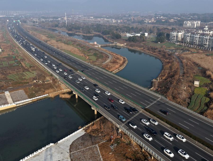 A drone photo taken on Feb. 4, 2025 shows vehicles on an expressway in Chaohu City, east China's Anhui Province. (Photo by Ma Fengcheng/Xinhua)