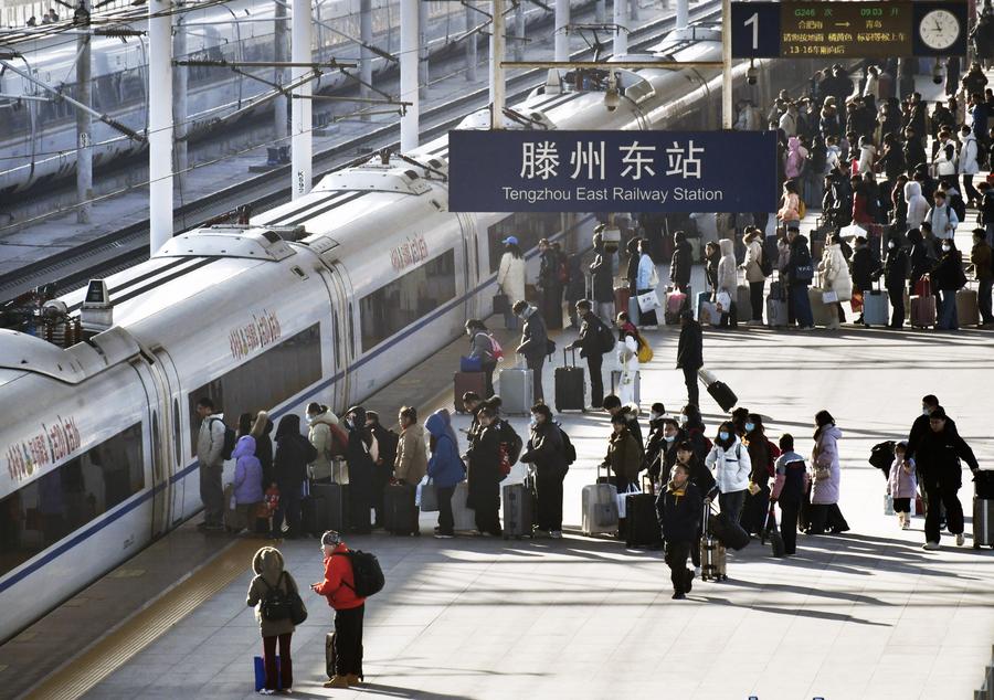 Passengers prepare to board the train at Tengzhou East Railway Station in Zaozhuang City, east China's Shandong Province, Feb. 4, 2025. (Photo by Li Zongxian/Xinhua)