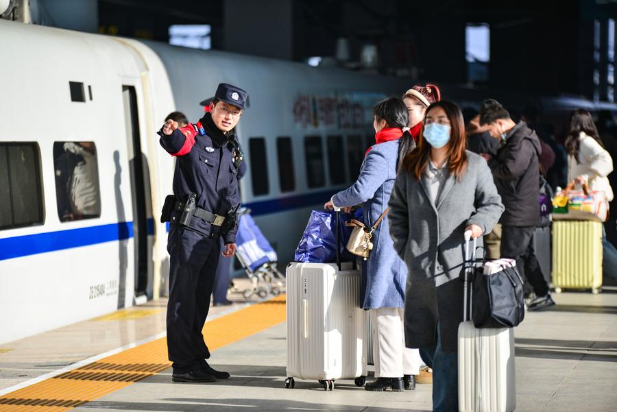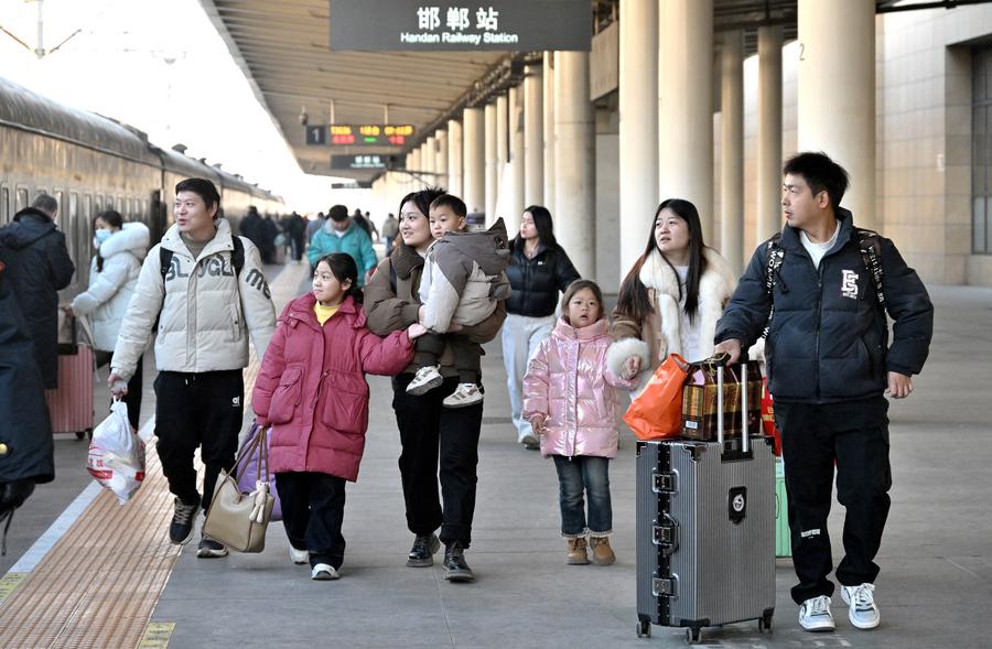 Passengers prepare to board the train at Handan Railway Station in Handan, north China's Hebei Province, Feb. 4, 2025. (Photo by Hao Qunying/Xinhua)