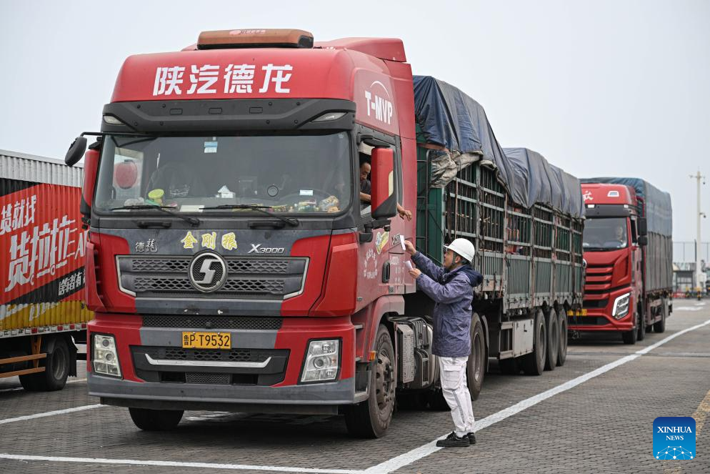 A driver gets his ticket checked inside his truck at Xinhai Port in Haikou, south China's Hainan Province, Feb. 3, 2025. Qiongzhou Strait has ushered in a travel peak for returning during the Spring Festival travel rush. To ensure the efficient transportation of fresh agricultural products, Xinhai Port and Xiuying Port in Haikou have implemented a reservation system for smooth boarding of transportation vehicles. Drivers can have their tickets purchased and checked without getting off their vehicles. (Xinhua/Pu Xiaoxu)