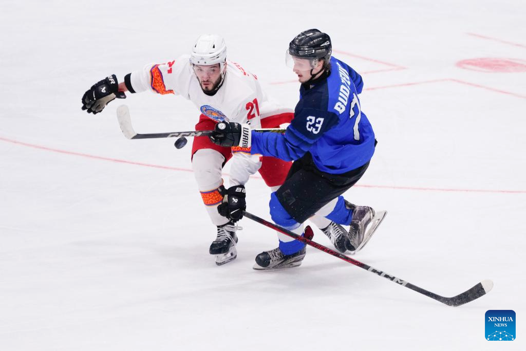 Mamed Seifulov (L) of Kyrgyzstan competes during the men's ice hocky group B match between Kuwait and Kyrgyzstan at 2025 Asian Winter Games in Harbin, northeast China's Heilongjiang Province, on Feb. 3, 2025. (Xinhua/Wang Jianwei)