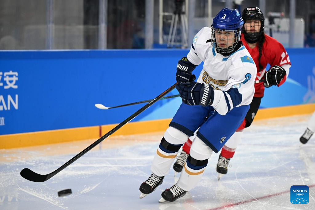 Munira Sayakhatkyzy (L) of Kazakhstan competes during the women's ice hocky group B match between Kazakhstan and China's Hong Kong at 2025 Asian Winter Games in Harbin, northeast China's Heilongjiang Province, on Feb. 3, 2025. (Xinhua/Chen Zhenhai)