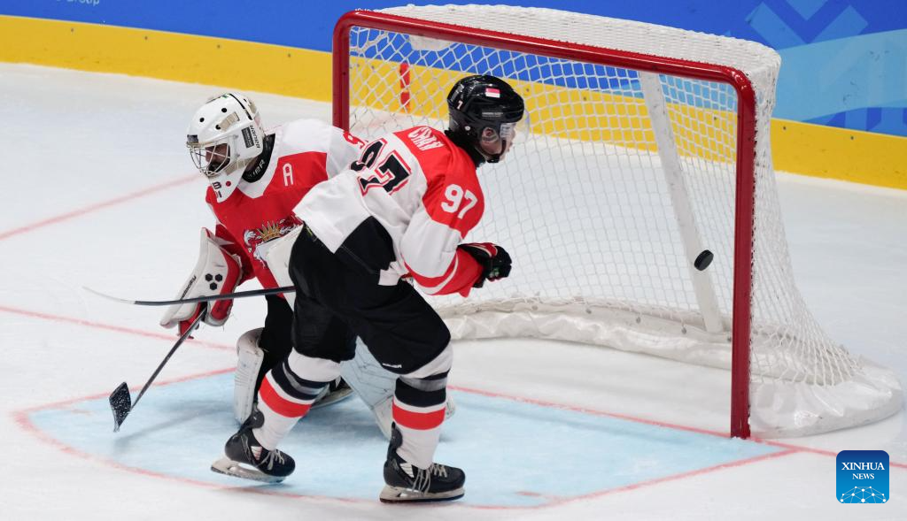 Chan Joshua Yu Wen (R) of Singapore shoots to score during the men's ice hocky group B match between Singapore and Bahrain at 2025 Asian Winter Games in Harbin, northeast China's Heilongjiang Province, on Feb. 3, 2025. (Xinhua/Wang Jianwei)