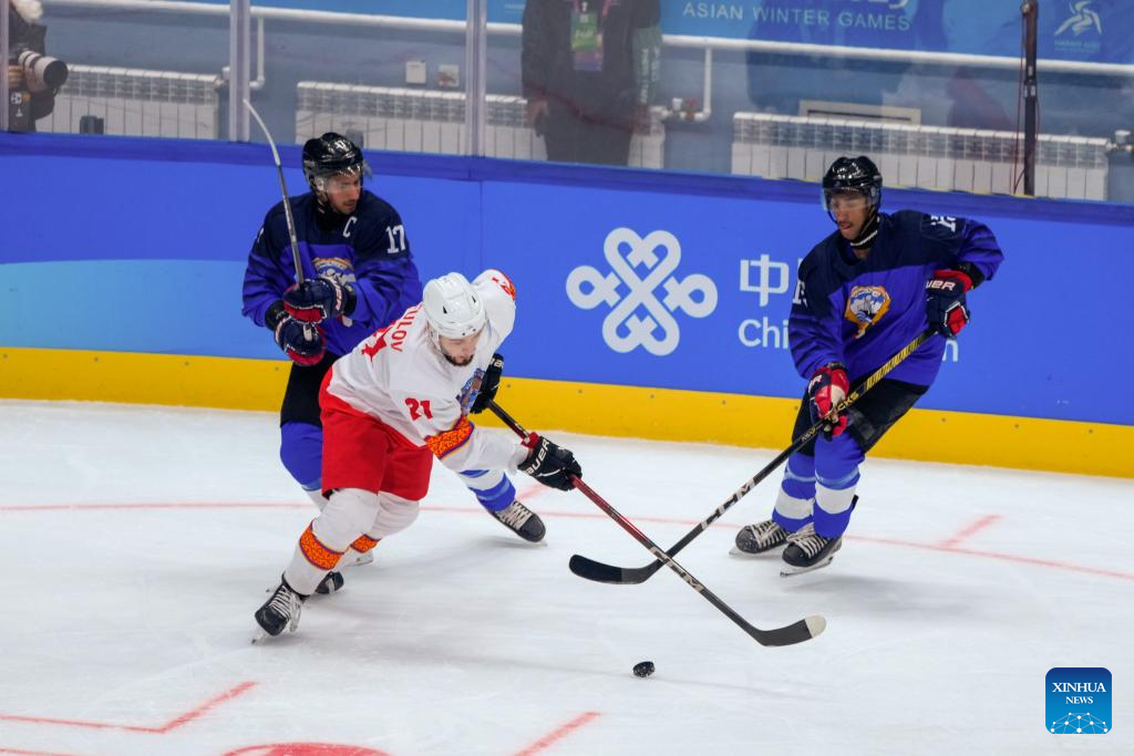 Mamed Seifulov (C) of Kyrgyzstan competes during the men's ice hocky group B match between Kuwait and Kyrgyzstan at 2025 Asian Winter Games in Harbin, northeast China's Heilongjiang Province, on Feb. 3, 2025. (Xinhua/Wang Jianwei)