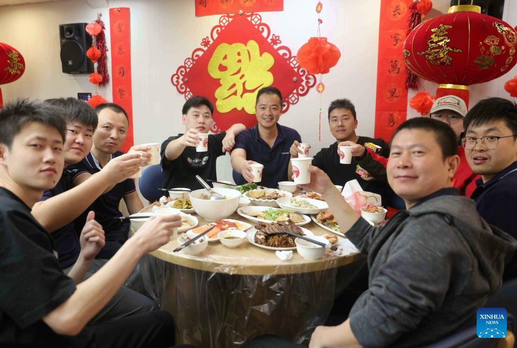 Members of China's 41st Antarctic expedition team enjoy their dinner on the eve of the Spring Festival aboard Chinese research icebreaker Xuelong 2, Jan. 28, 2025. Chinese research icebreaker Xuelong 2, or Snow Dragon 2, is conducting a month-long marine ecosystem survey in the Amundsen Sea. Members of the expedition team celebrated the Spring Festival through various activities as a brief respite from their busy work. (Xinhua/Huang Taoming)