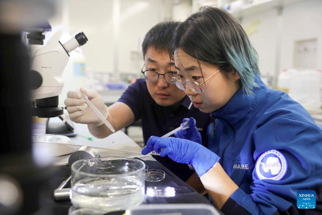 Members of China's 41st Antarctic expedition team categorize plankton in a laboratory on Chinese research icebreaker Xuelong 2, Jan. 26, 2025. (Xinhua/Huang Taoming)