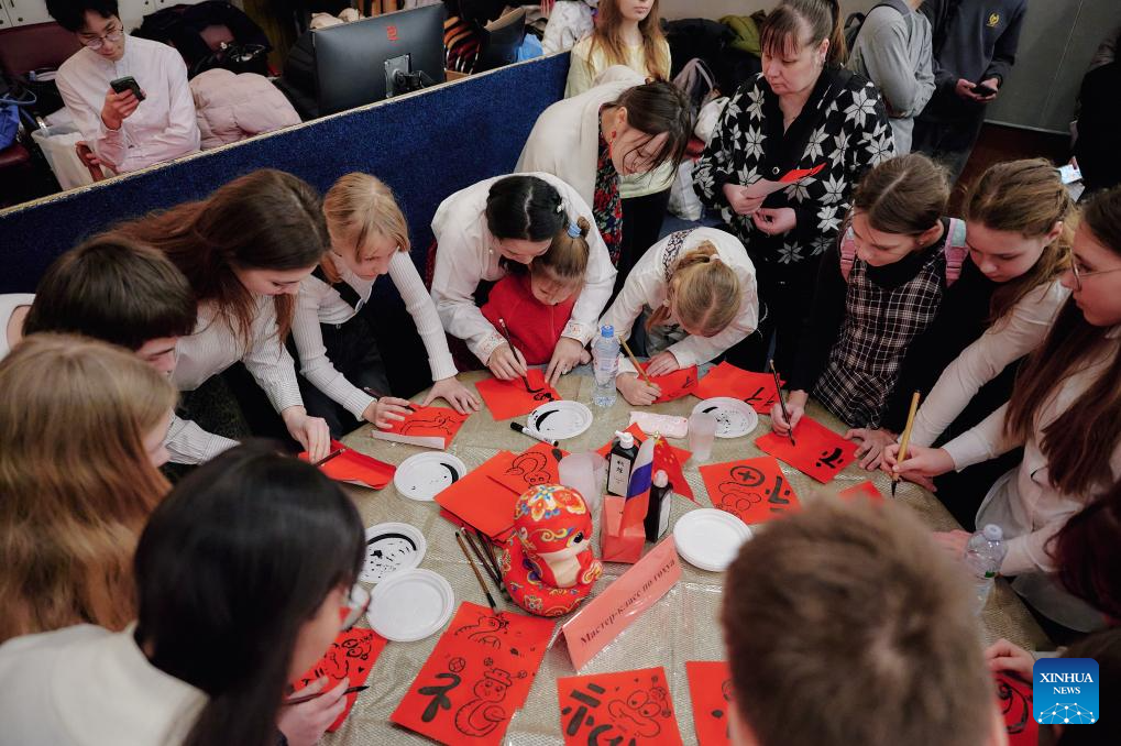 Students try Chinese calligraphy during the ninth Chinese New Year School Festival in St. Petersburg, Russia, Feb. 3, 2025. St. Petersburg hosted its ninth Chinese New Year School Festival on Monday, as nearly 1,000 students and parents celebrated the Spring Festival with a vibrant cultural gala. Co-organized by the Chinese Consulate General in St. Petersburg and the local Confucius Institute of Oriental Languages and Cultures, the gala is a flagship event of the city's "Happy Chinese New Year" celebrations. (Photo by Irina Motina/Xinhua)