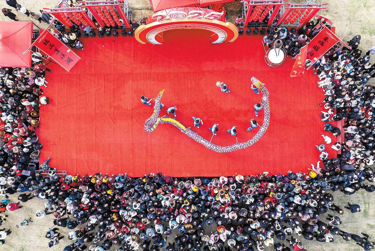 Residents watch a dragon dance performance in Xinghua, Jiangsu province, on Sunday during Spring Festival celebrations. Various events, including folk activities and intangible cultural heritage displays, have been held across China to celebrate the Spring Festival. (Zhou Shegen/Xinhua)