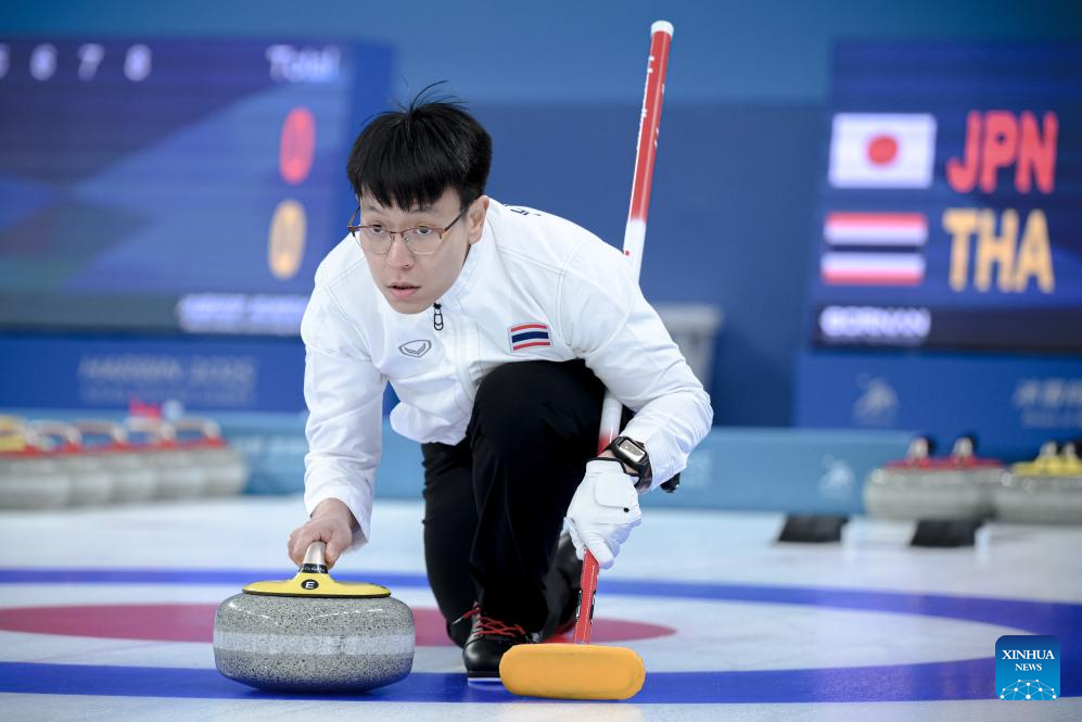 Teekawin Jearateerawit of Thailand competes during the mixed doubles Round Robin Session 1 match between Koana Tori/Aoki Go of Japan and Chanatip Sonkham/Teekawin Jearateerawit of Thailand in the curling event at 2025 Asian Winter Games in Harbin, northeast China's Heilongjiang Province, Feb. 4, 2025. (Xinhua/Jiang Han)