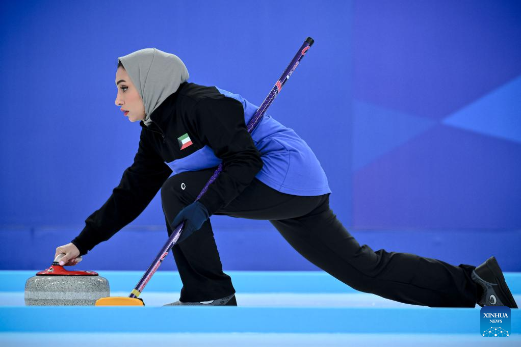 Fatema Abdulateef of Kuwait competes during the mixed doubles Round Robin Session 1 match between Fatema Abdulateef/Saud Alkandari of Kuwait and Enkhzaya Ganbat/Bayar Bulgankhuu of Mongolia in the curling event at 2025 Asian Winter Games in Harbin, northeast China's Heilongjiang Province, Feb. 4, 2025. (Xinhua/Jiang Han)