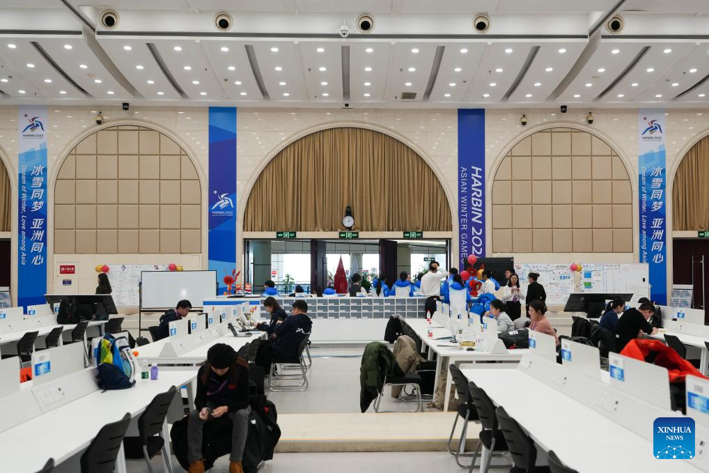 The main press center in the Main Media Center (MMC) of the 2025 Asian Winter Games is seen in Harbin, northeast China's Heilongjiang Province, Feb. 5, 2025. (Xinhua/Zheng Huansong)