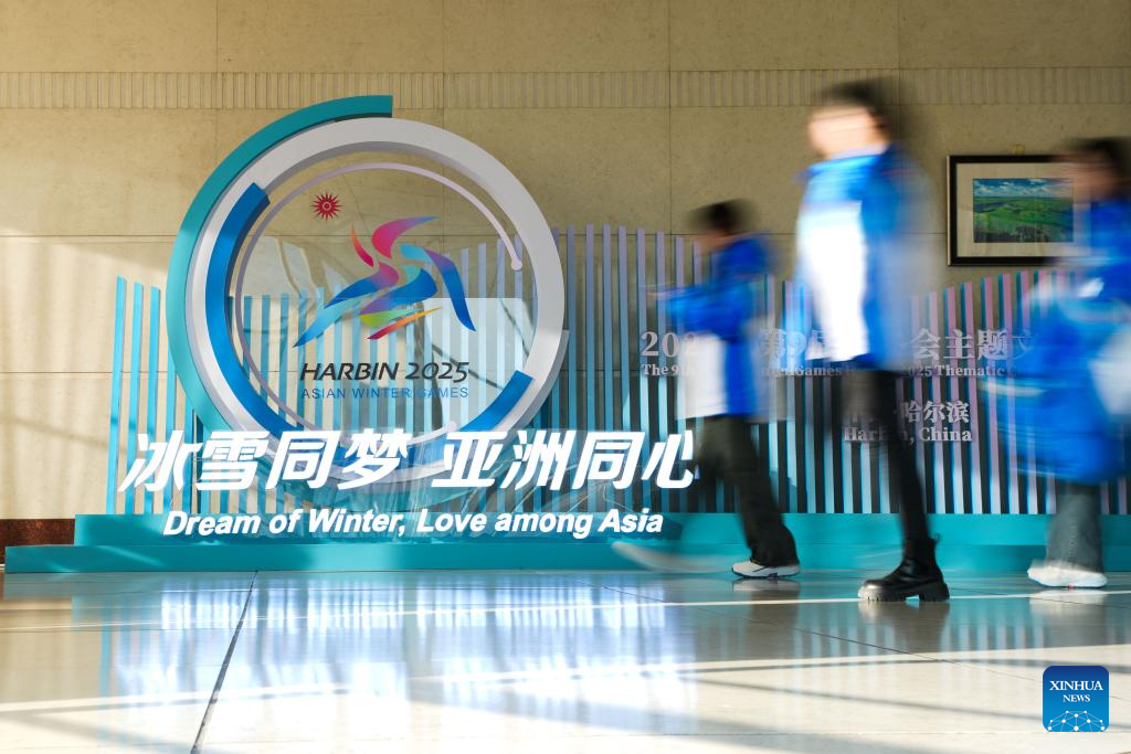 Volunteers pass an installation for the 2025 Asian Winter Games at the main press center in the Main Media Center (MMC) in Harbin, northeast China's Heilongjiang Province, Feb. 5, 2025. (Xinhua/Zheng Huansong)