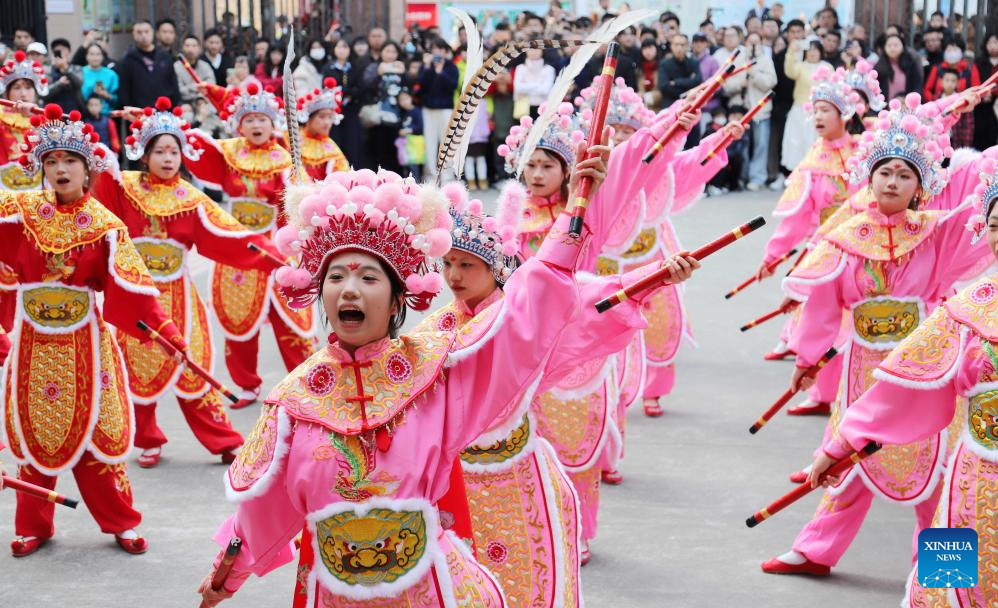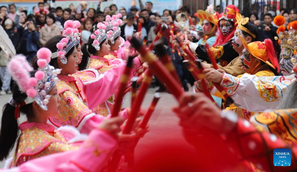 A Yingge dance team performs during an event celebrating the Spring Festival in Shantou, south China's Guangdong Province, Feb. 2, 2025. (Photo by Yao Jun/Xinhua)